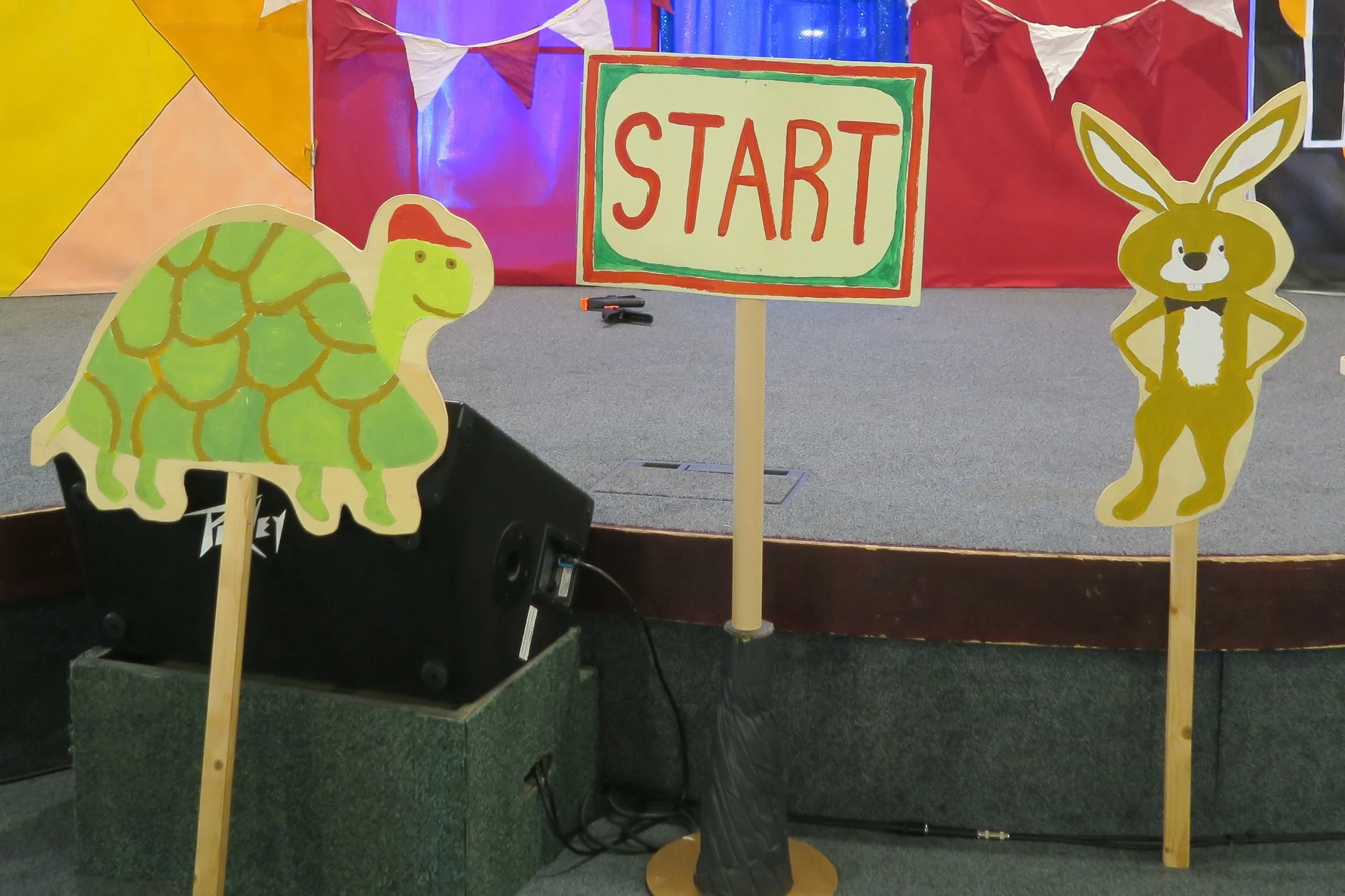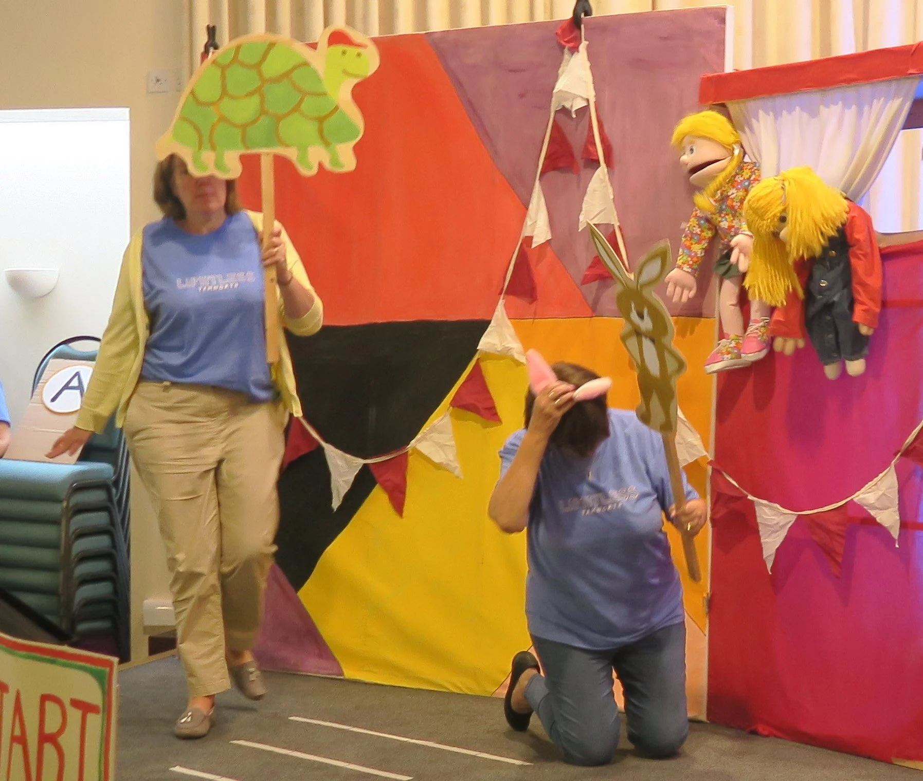 And they’re off on the first lap and straightway Harry hare goes into the lead, Harry seems very confident of a win here. Tommy tortoise is off to a slow but steady start. It’s Harry who gets to the steps first and he’s up on stage. Tommy follows on behind but wait Harry has stopped for a quick rest and yes Tommy who isn’t stopping is passing Harry. Harry doesn’t seem to be put out and after a short break, Harry is back on his feet after Tommy. Tommy has got to the next steps first, so Harry is having to wait but now they are both down the steps and Harry is looking to overtake Tommy and get into the lead once more. As they finish the first lap it’s still Harry out in front.