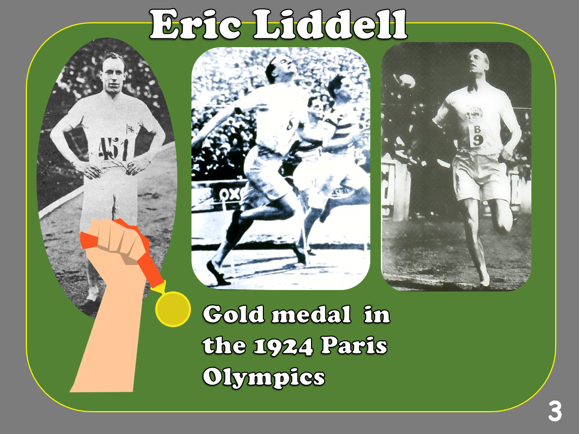 I’m not a one for races I didn’t like races at school at all. But here’s a story about a race I love. It’s a story about a famous Scottish athlete called Eric Liddell. (SLIDE 3)