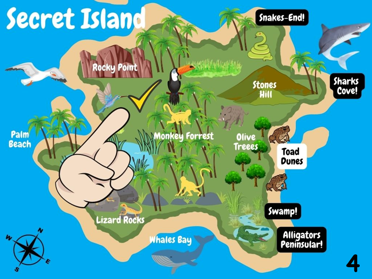 SLIDE 4 - (Secret Island Map with big tick at base camp.)