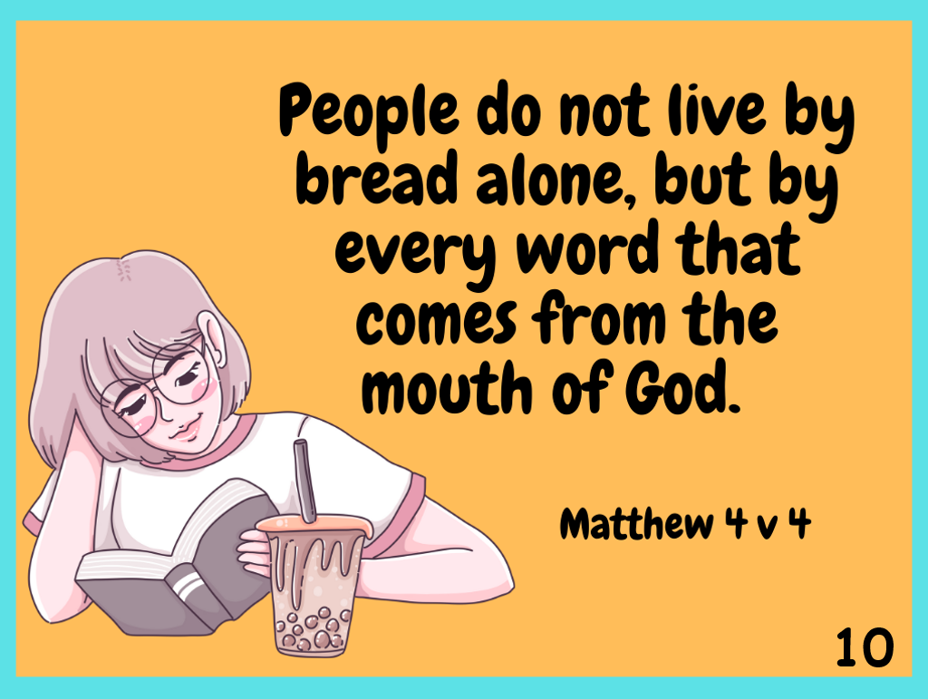 SLIDE 10 - Jesus also said something else about bread, He said that people shall not live by bread alone but by every word that comes from the mouth of God. You see knowing and following the teachings of Jesus feeds who we are, it feeds our mind and heart. That is why Jesus called himself the bread of life. If we have Jesus in our lives we have real life, the life God wants us to have.