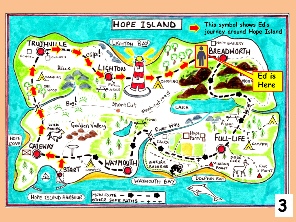 Narrator: (SLIDE 3) Well, here we are again picking up with Ed, he’s now half way round Hope Island, Ed’s had such a good time so far, I wonder who he will meet today.