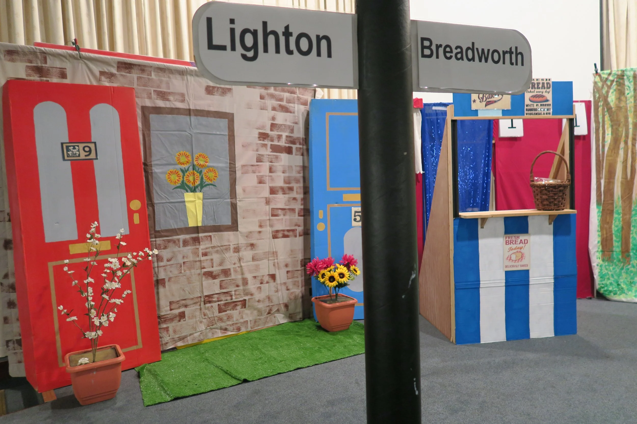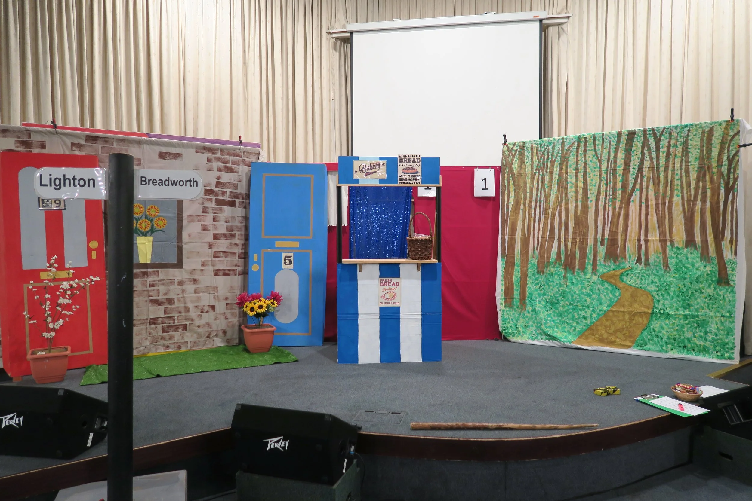Stage set pic’s below with mock-up baker/s kiosk centre stage, painted sheet backdrops, cardboard house doors and interchangeable signpost. Many of the items in the pictures are used over and over again in different ways in other dramas of Impact Kids themed series.