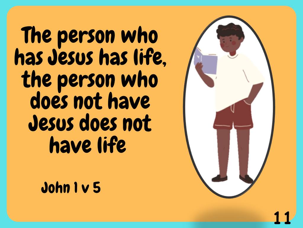 SLIDE 11 - The Bible also says these words found in John 1 chapter 5 verse 12, ‘He or she that has Jesus has life and he or she that does not have Jesus does not have life. ‘